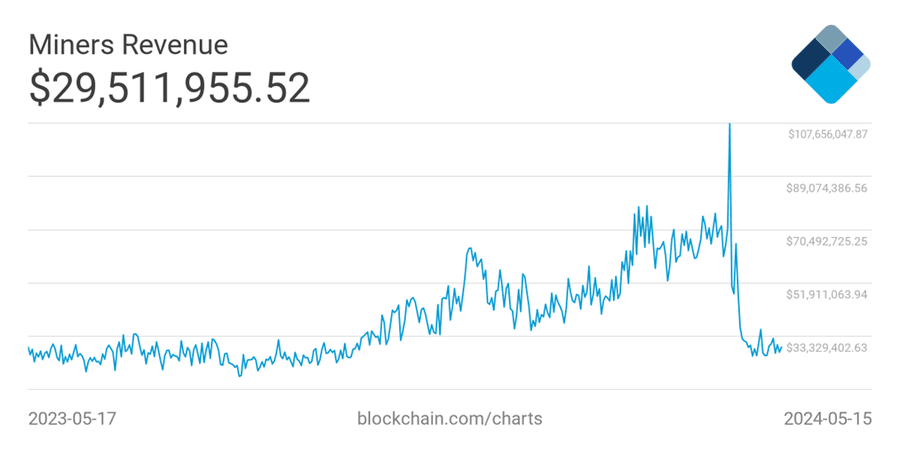 Despite the promising start, the Runes party has quickly faded. The previous charts have already provided the spoiler, showing the dramatic decline in transaction fees and miner revenue. On May 8, miner revenue hit the lowest level since mid-October 2023.