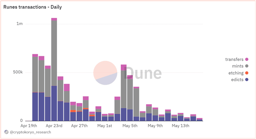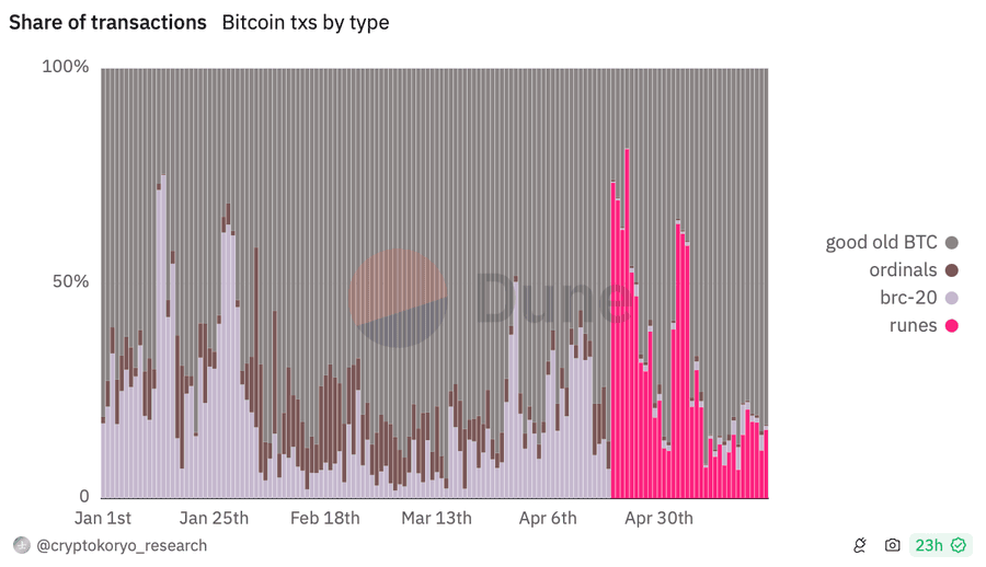 For about two weeks, Runes accounted for a good chunk of all Bitcoin transactions, and its share exceeded 50% on several occasions, according to data shared via Dune.