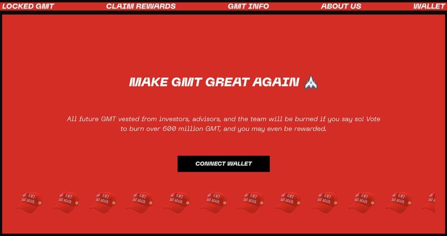- Lock and Vote: GMT holders can participate by visiting burngmt.com, where they can lock their tokens and cast their vote on various proposals, including the first of its kind “GMT Burn Initiative”. Participants will receive an exclusive soulbound ‘Make GMT Great Again’ Red Hat NFT as a token of acknowledgement for their involvement. This NFT will record metadata detailing the claimed and eligible airdrops, as well as the votes cast.
