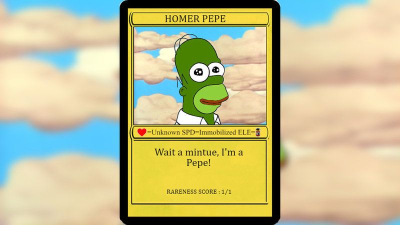 EverdreamSoft in 2015 used the Bitcoin network to launch the first NFT trading cards game. Spells of Genesis provides players with historical nonfungible tokens where each one represents a specific moment in history. At this time, many projects had already joined the space. Rare Pepes, the popular digital collectible cards platform launched in 2016 with approximately 1,800 cards featuring distinct meme characters for Pepe the Frog. Each of the cards represents Pepe as Trump, Satoshi Nakamoto, Homer Simpson, or Andreas Antonopoulos, among others. The Homer Pepe card gained popularity in 2018 when it sold for $38,500 in a blockchain art live auction.