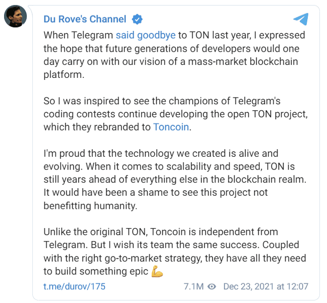 In December 2021, Pavel Durov openly supported Toncoin developers: