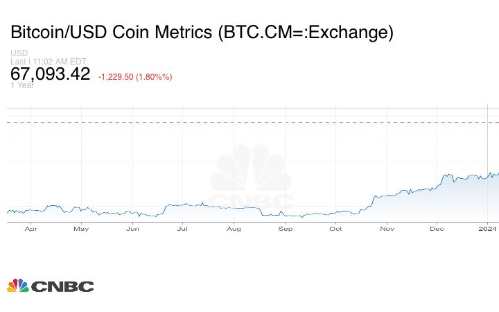 Bitcoin is still up roughly 60% since the beginning of the year, but last night’s drop came from almost record highs. The cryptocurrency has surged in recent months, partly due to expectations, and then demand from new Bitcoin ETFs launched in the US in January.