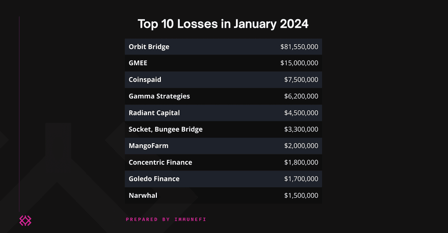 Hacks dominated the causes of losses, accounting for $122,709,800 across 14 specific incidents. Two notable projects, Orbit Bridge and Gamee (GMEE token), incurred substantial losses of $81,550,000 and $15,000,000, respectively.