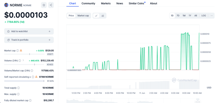 Normie has not made any other statements regarding the controversial post or the intern. Perhaps they don’t mind the publicity after all. However, in other news, NORMIE is facing some serious “abnormie” times. The coin is experiencing major volatility, with prices rising and falling over the past 24 hours. At the time of this writing, NORMIE is set at $0.00001031.