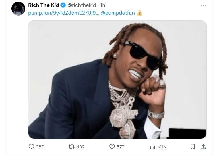 In the X account of American rapper Rich The Kid, a link was posted for his 2.3 million followers to buy a new token called “RICH,” launched on the meme coin creation tool Solana pump.fun.