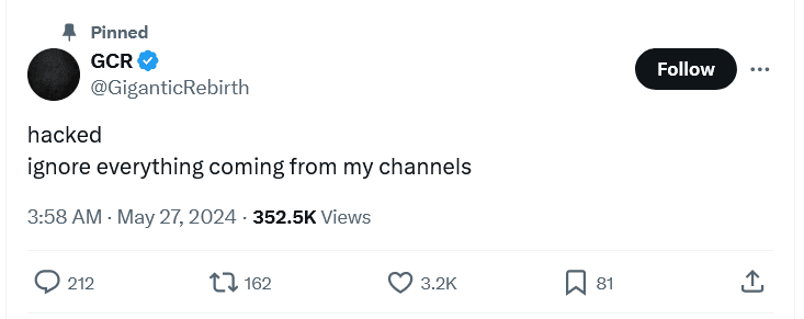 Among the latest victims is Gigantic-Cassocked-Rebirth, known as GCR, a pseudonymous crypto investor famous for profiting from contrarian trades. On May 26, a message about ORDI and Luna2.0 was posted on GCR’s X account, causing both tokens to momentarily spike by 6% and 274%. The crypto investor confirmed his account was hacked and urged followers not to click on any links.