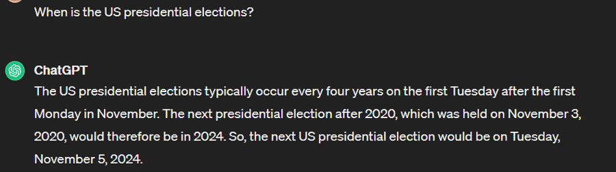 As you pose the same question to ChatGPT, Gemini’s competitor from OpenAI, gives a more detailed answer: “The 2024 US presidential elections are scheduled for Tuesday, November 5, 2024.”