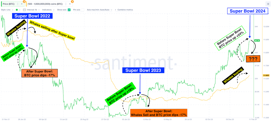 Thank you! After the end of the final game, the BTC slightly declined. The Super Bowl did not feature any crypto ads for the second year in a row. Even trillion-dollar companies with Bitcoin ETFs were unwilling to pay the $7 million advertising fee.