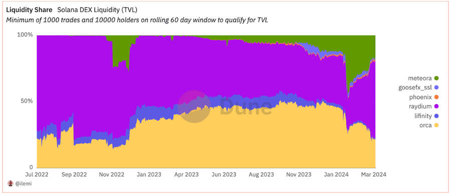 When it comes to liquidity, Raydium keeps its crown. As of March 25th, Raydium was holding tokens worth $694.9 million, making up 58.6% of the total liquidity on Solana’s DEX. Orca’s liquidity clocked in at $205.7 million, or 21.1% of the shares, while Meteora claimed just over $201 million, or 17%.