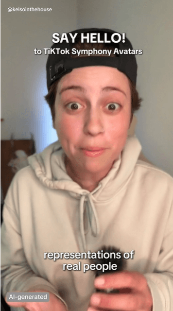 TikTok will automatically label videos created with its AI tools as AI-generated “for full transparency.” A demo video featuring AI-cloned content creators shows a tiny label in the corner.