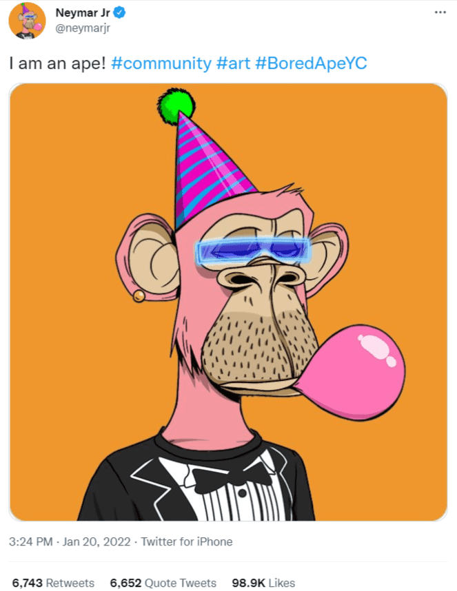 Following in the footsteps of other famous figures, Neymar reportedly spent £900,000 buying two NFTs from the Bored Apes Yacht Club. Famous people and crypto enthusiasts often flaunt their understanding of the crypto realm and membership in the popular set using these “Ape” NFTs. These NFTs are digital images of monkeys with different characteristics, including hair, facial features, and emotions.