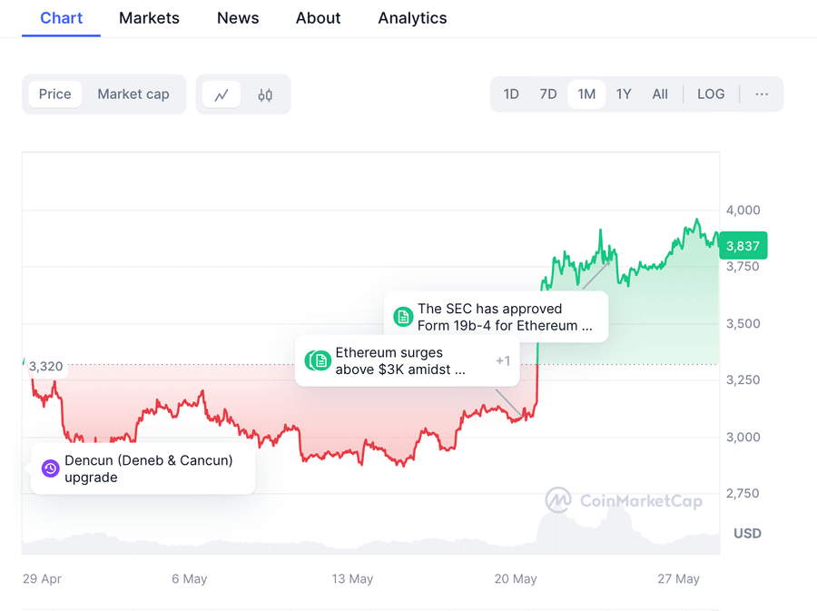 ETH coin was trading at $3,151 this time last month, but it is currently trading at $3,745.28.