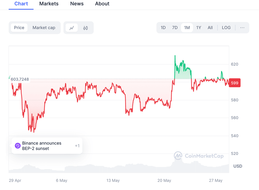 BNB has also been one of the cryptos with fair price stability. This time last month, it was selling at around $600.91, and it is now going for $602.21 per coin.